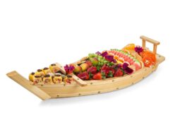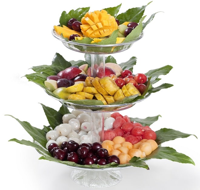 שתי קומות של פירות העונה – שמוגשים בכלי יוקרתי מפלסטיק, על מצע עלי אריליה, בעיצוב מיוחד, מפתה ומזמין.