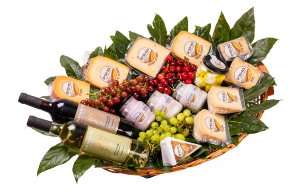 בצירוף יינות בנימינה ריזלינג וקברנה סוביניון על מצע סלסלה גדולה מהודרת,